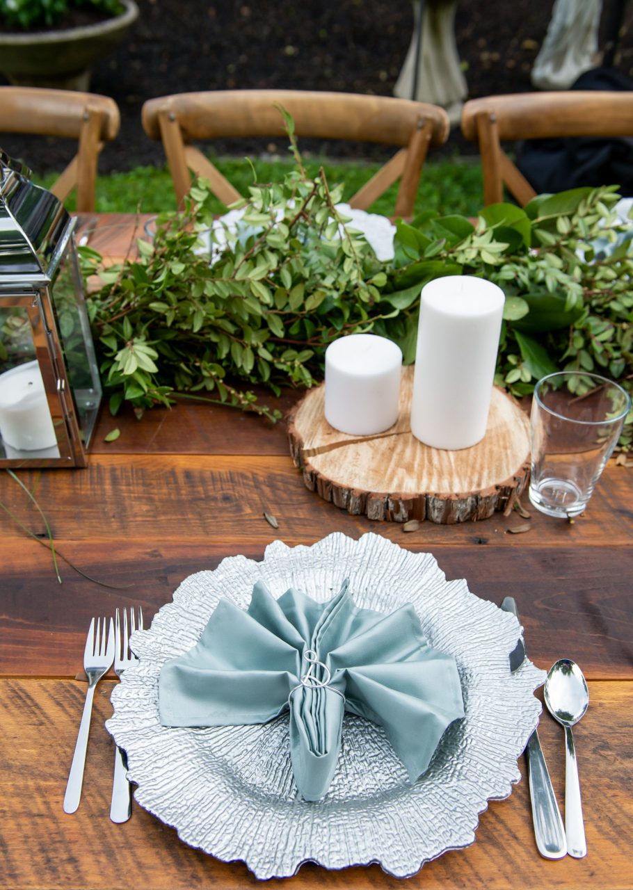 When designing a wedding, you first begin with the space. It’s easy enough when you’re in a hotel or historic site, but when your goal is a backyard wedding, lots of questions arise. What are you working with? Are there areas that need to be draped and/or hidden? What is the flow of people? Like many couples this year, Clara and Andrew’s original plans were not to be in their backyard for the wedding but rather at Glen Echo Park. Undeterred, however, they decided to go forward with their nuptials, and have an intimate family backyard wedding, and what a hit it was!