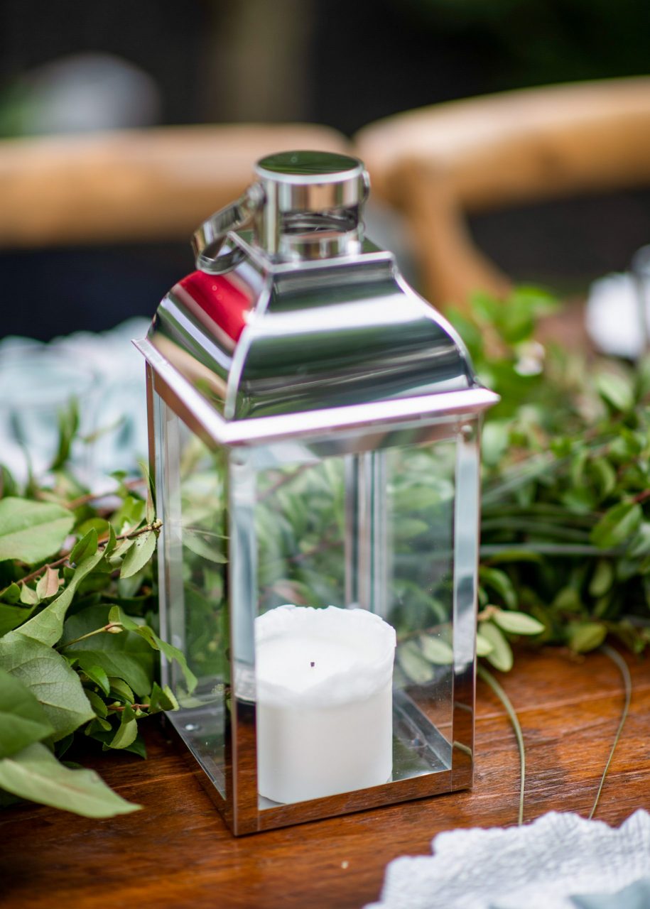 Farm tables and garland absolutely transformed the back yard reception space into the site of a festive and intimate family celebration. Wood disks with candles, lanterns, and mason jars filled with wedding blooms added yet another gorgeous texture to the table.