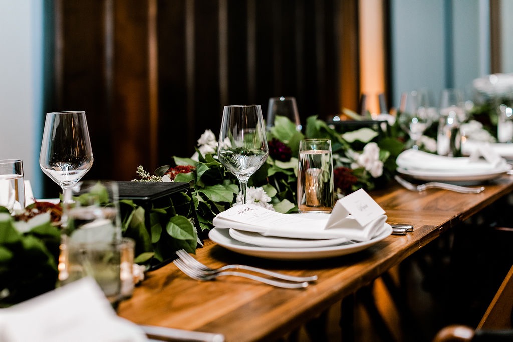 Rustic, organic and elegant were our mantras for the flowers for Aissa’s and Joe’s reception at District Winery, as we created lush garlands of salal, silver dollar and seeded eucalyptus, accented with dahlias, astilbe, roses, and stock for practically every surface in sight! In addition to the garlands, we further adorned the room with clusters of greenery for the floor lanterns furnished by District Winery, as well as stemmed votive candles of varying heights and vases for displaying the bouquets.