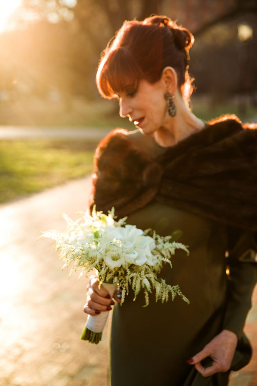 Few wedding venues are as romantic and elegant as the Hay Adams Hotel in Washington, DC, which is just one of the reasons we were thrilled to design Robin and Chuck’s flowers for their reception. Everything about the couple’s elegant Hay Adams wedding was sophisticated, including their classic winter white color palette! Creating a stunning contrast to Robin’s unique olive gown was her sophisticated, white-hued French hand-tied bouquet. Mini calla lilies were ringed with a collar of winter white astilbe and wrapped in ivory satin ribbon, finished with delicate pearl-headed pins. Chuck’s boutonnière was timeless and white as well, combining a complementary mini calla lily and winter white astilbe, wrapped in masculine black ribbon.