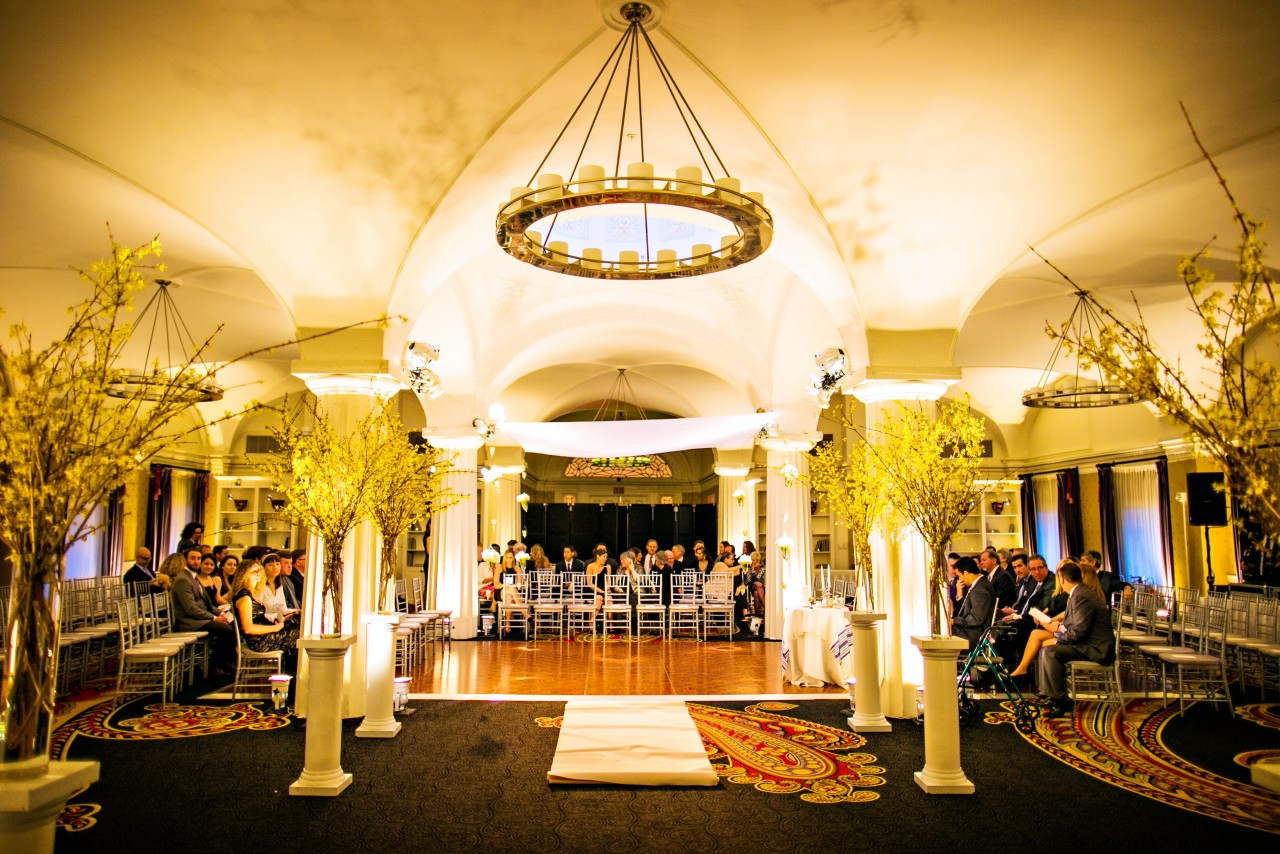 The ballroom of the Hotel Monaco transformed into a romantic haven. A white organza panel beneath the dome, adorned with a line of hanging votives and textured white flowers, created an ethereal canopy. The drama was heightened by the dramatic yellow forsythia branches lining the aisle.