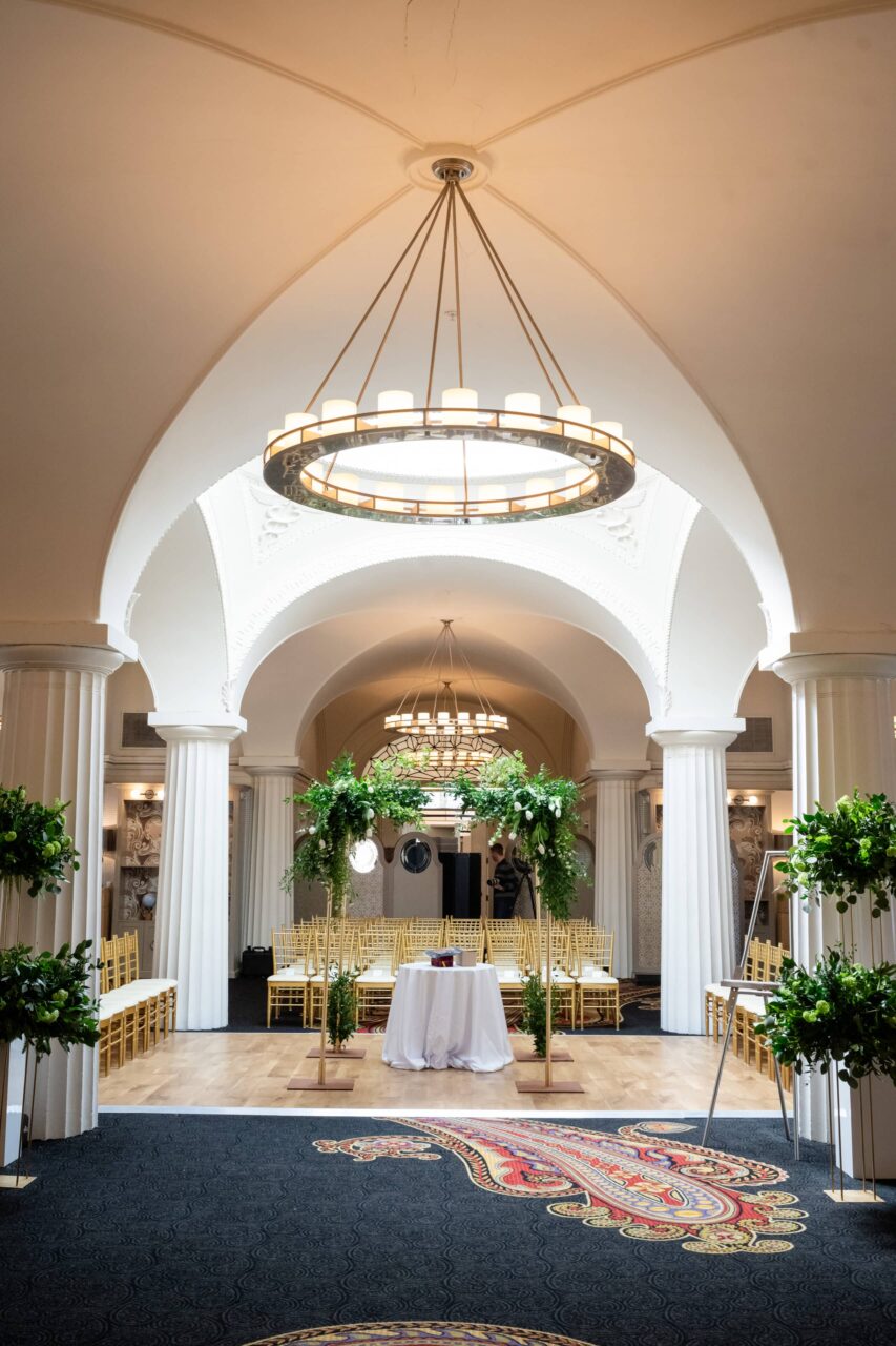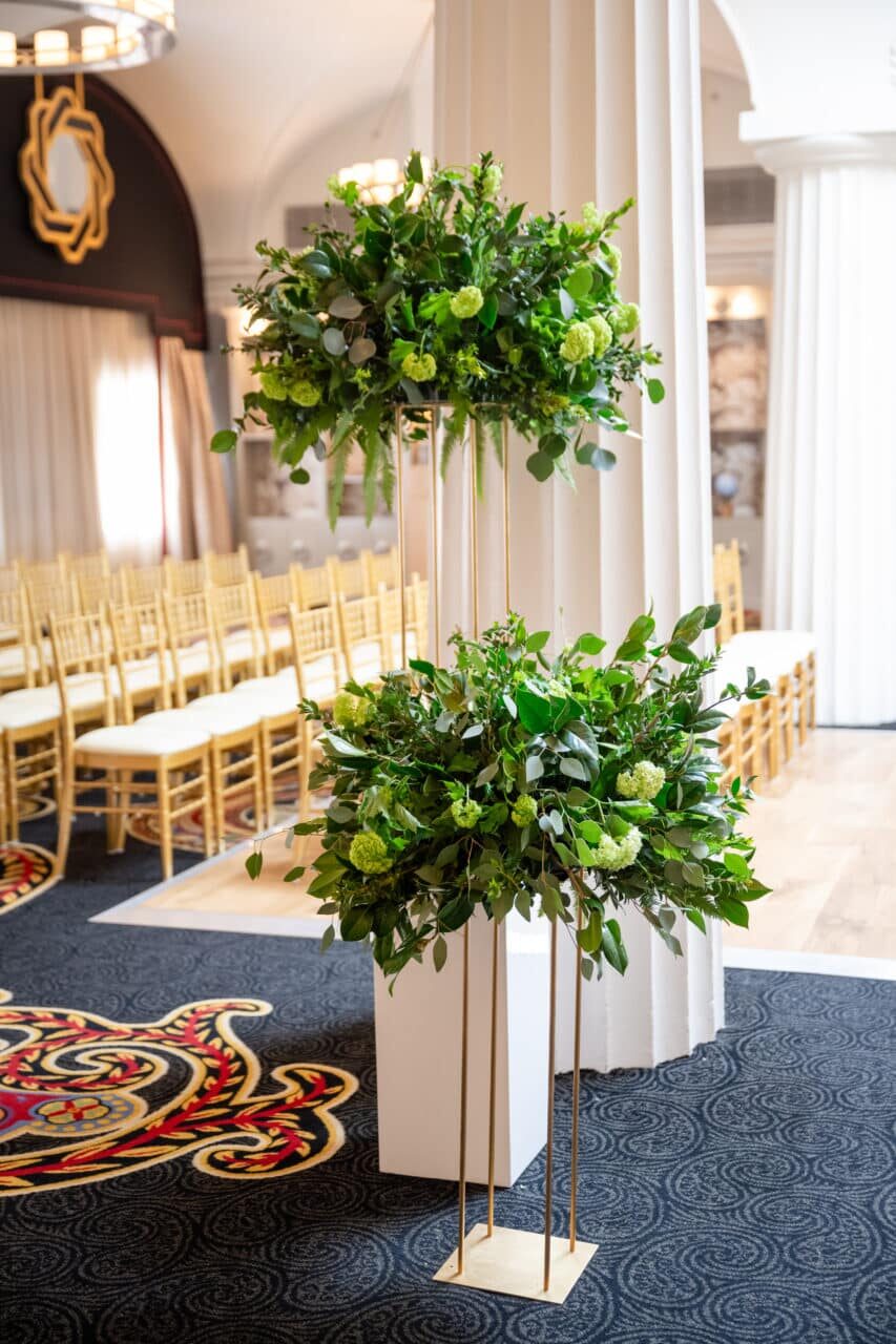 Adam and Jason’s ceremony took place beneath the iconic rotunda in the Paris Ballroom, where a sleek, contemporary chuppah stole the show. The structure, crafted from four gold-painted poles, supported a luxurious white silk dupioni canopy. Greenery-focused arrangements of Italian ruscus were placed in the corners, accented with white tulips, and spirea to bring a fresh, spring touch that highlighted the grandeur of the venue. The clean, sophisticated lines of the floral design perfectly matched the grooms’ modern aesthetic. Lush green arrangements topped pedestals flanking the entrance to the rotunda.