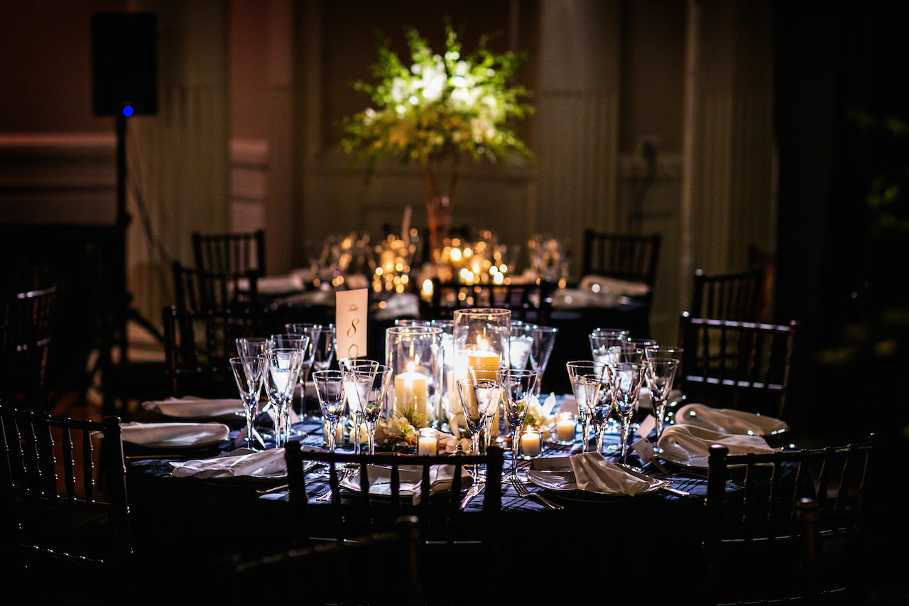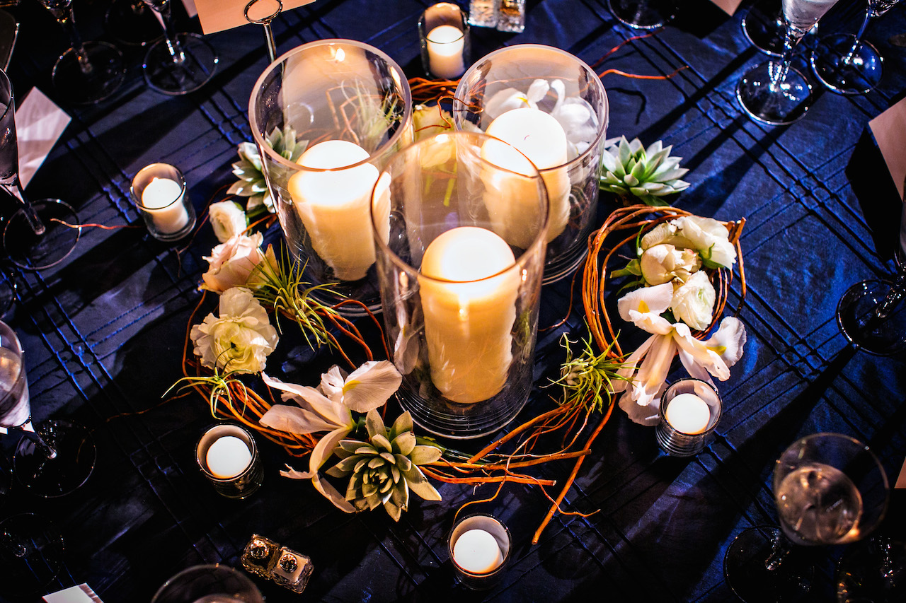 The reception featured a mix of tall and low arrangements, blending a mix of drama, candlelight, and intimacy. Half the tables featured an organic tablescape of curly willow branches vining around a cluster of three glass cylinder vases. The branches were accented with gray-green succulents, air plants, white ranunculus, champagne roses, and white iris.